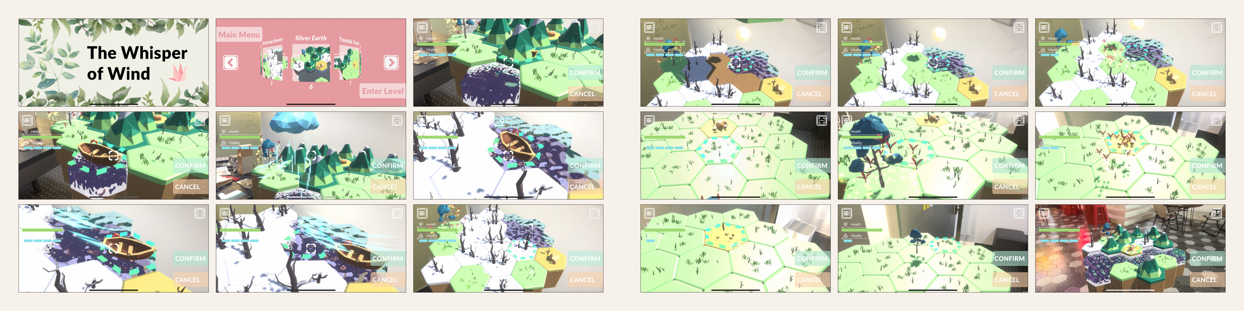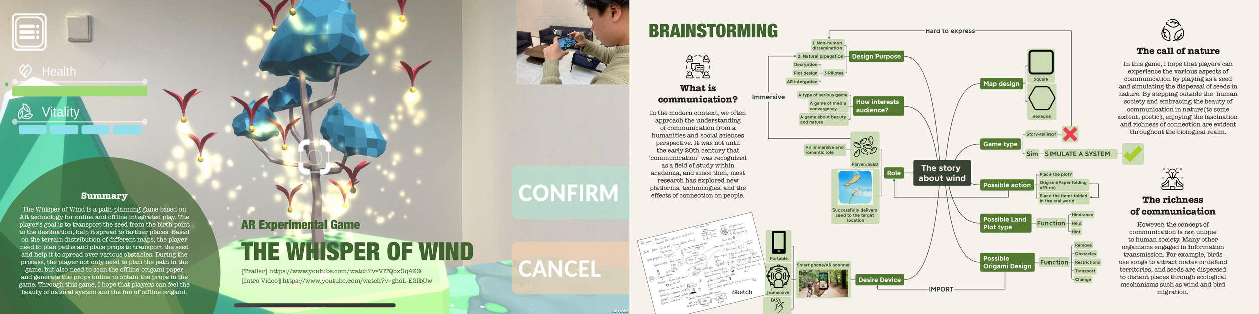 The Whisper of Wind is a path-planning game based on AR technology for online and offline integrated play. The player's goal is to transport the seed from the birth point to the destination, help it spread to farther places. Based on the terrain distribution of different maps, the player need to plan paths and place props to transport the seed and help it to spread over various obstacles. During the process, the player not only need to plan the path in thegame, but also need to scan the offline origami paper and generate the props online to obtain the props in the game. Through this game, I hope that players can feel the beauty of natural system and the fun of offline origami.